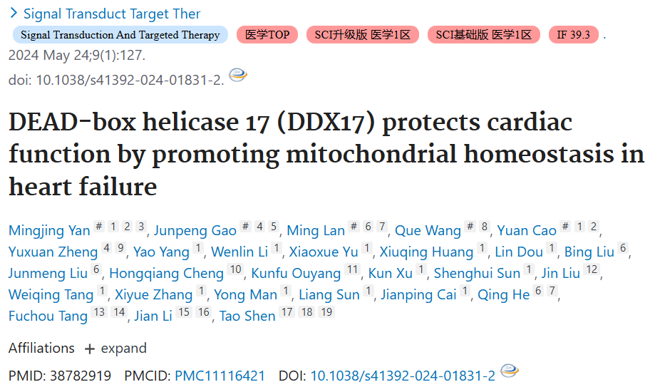 北京大学沈涛、黎健及汤富酬共同通讯在Signal Transduction and Targeted Therapy发表的题为“DEAD-box helicase 17 (DDX17) protects cardiac function by promoting mitochondrial homeostasis in heart failure”的研究性论文。