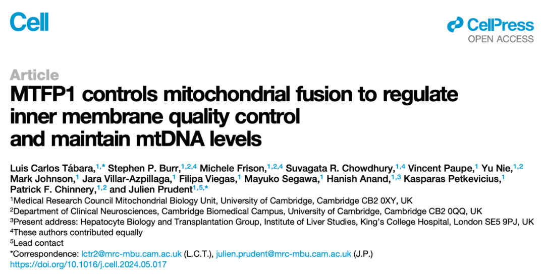 2024年6月7日,剑桥大学的研究人员在国际顶尖学术期刊 Cell 上发表了题为:MTFP1 controls mitochondrial fusion to regulate inner membrane quality control and maintain mtDNA levels 的研究论文。