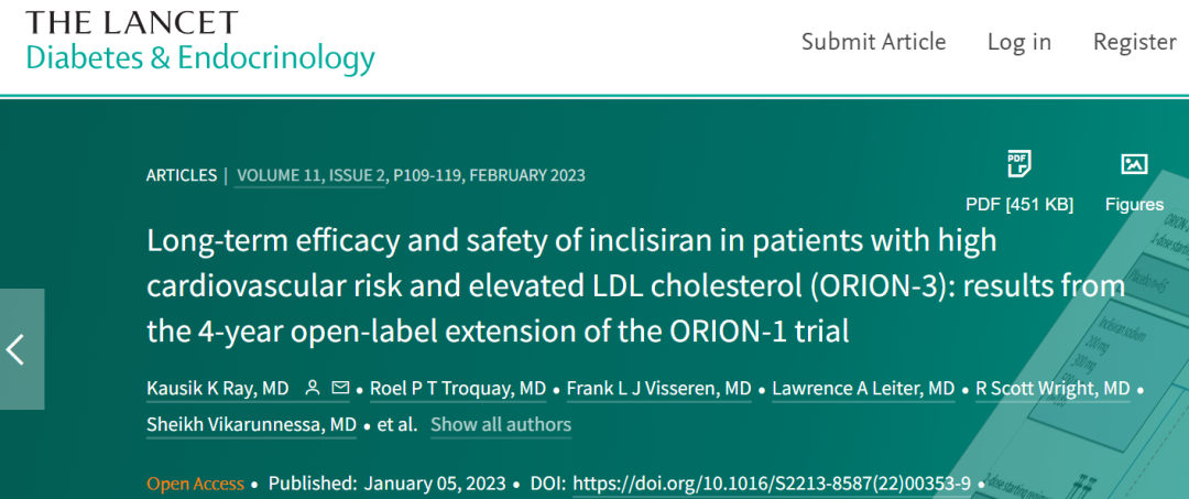 [1] Kausik K Ray et al. Long-term efficacy and safety of inclisiran in patients with high cardiovascular risk and elevated LDL cholesterol (ORION-3): results from the 4-year open-label extension of the ORION-1 trial. The Lancet Diabetes & Endocrinology 2023; doi: 10.1016/S2213-8587(22)00353-9