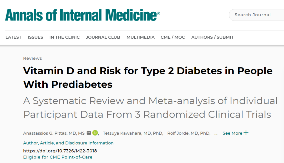 [1] Pittas AG, Kawahara T, Jorde R, et al. Vitamin D and Risk for Type 2 Diabetes in People With Prediabetes : A Systematic Review and Meta-analysis of Individual Participant Data From 3 Randomized Clinical Trials. Ann Intern Med. 2023 Feb 7. doi: 10.7326/M22-3018. Epub ahead of print. PMID: 36745886.