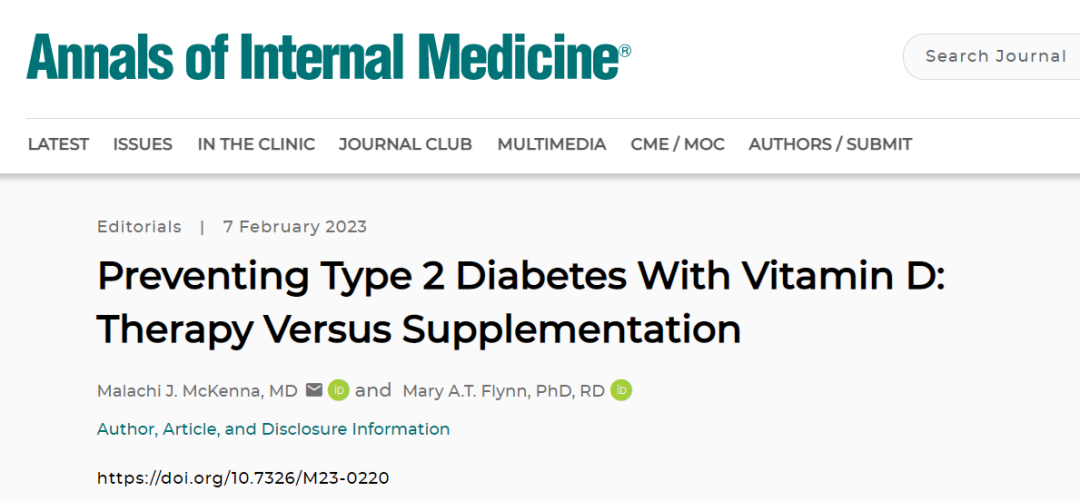 [3] McKenna MJ, Flynn MAT. Preventing Type 2 Diabetes With Vitamin D: Therapy Versus Supplementation. Ann Intern Med. 2023 Feb 7. doi: 10.7326/M23-0220. Epub ahead of print. PMID: 36745887.https://www.acpjournals.org/doi/pdf/10.7326/M22-3018