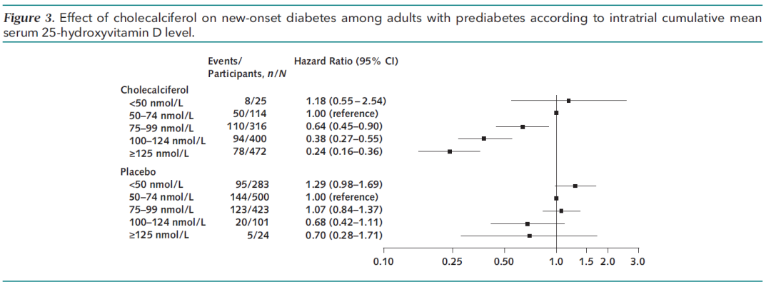 2)25(OH)D水平>50 ng/ml的受试者,新发糖尿病发病风险比为0.24,相比于20~29 ng/ml的受试者,3年内糖尿病发病绝对风险降低18.1%。