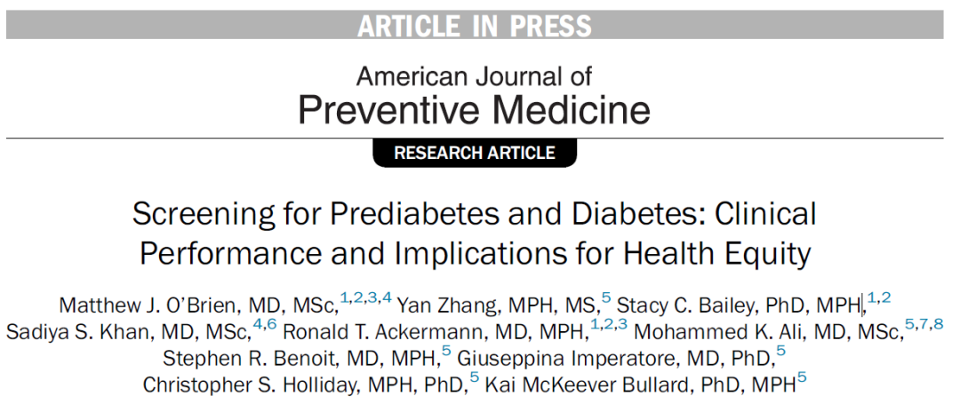 [1] Matthew J. O’Brien, Yan Zhang, Stacy C. Bailey, et al. Screening for Prediabetes and Diabetes: Clinical Performance and Implications for Health Equity. Am J Prev Med 2023;000(000):1−10. DOI:https://doi.org/10.1016/j.amepre.2023.01.007