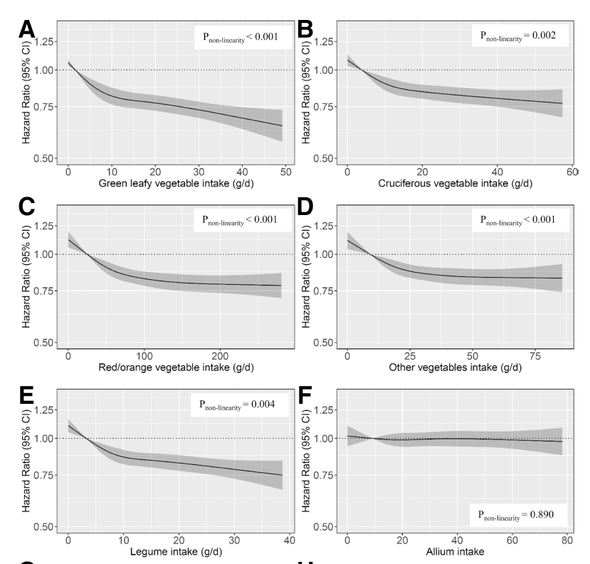 分析不同类型蔬菜的影响发现,除葱蒜类蔬菜外,绿叶蔬菜和十字花科蔬菜吃的越多,2型糖尿病发病风险越低。