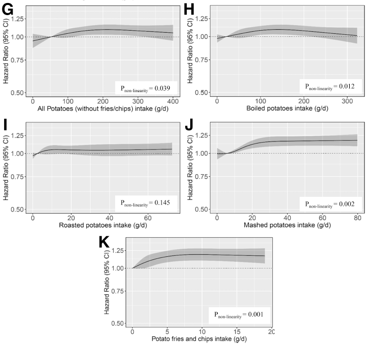 ▲DCH研究受试者土豆摄入量与2型糖尿病发病风险相关性,图G:所有土豆(不含薯条/薯片);图H:水煮土豆;图I:烤土豆;图G:土豆泥;图K:薯条/薯片(图片来源:参考资料[1])
