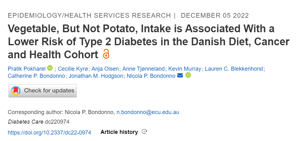 [1] Pokharel P, Kyrø C, Olsen A, Tjønneland A, Murray K, Blekkenhorst LC, Bondonno CP, Hodgson JM, Bondonno NP. Vegetable, But Not Potato, Intake is Associated With a Lower Risk of Type 2 Diabetes in the Danish Diet, Cancer and Health Cohort. Diabetes Care. 2022 Dec 5:dc220974. doi: 10.2337/dc22-0974. Epub ahead of print. PMID: 36463930.