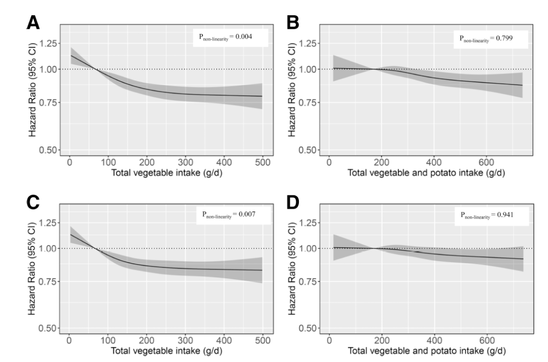 ▲蔬菜总摄入量纳入(图B和图D)或不纳入(图A和图C)土豆与疾病的相关性。图A和B包含BMI作为协变量,图C和图D不包含BMI作为协变量(图片来源:参考资料[1])
