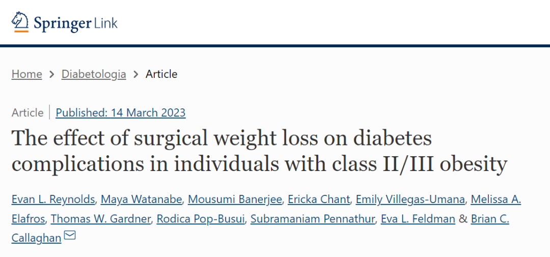 [1]Reynolds, E.L., Watanabe, M., Banerjee, M.et al. The effect of surgical weight loss on diabetes complications in individuals with class II/III obesity. Diabetologia (2023). https://doi.org/10.1007/s00125-023-05899-3