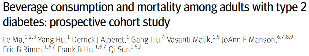 该研究纳入共15486例来自护士健康研究(1980年~2018年,11399例)和卫生专业人员随访研究(1986年~2018年,4087例)在基线和随访期间被诊断为2型糖尿病的患者。研究团队使用经过验证的食物频率问卷评估饮料摄入情况,并每两到四年更新一次数据。主要结局为全因死亡率,次要结局是心血管疾病发病率和死亡率。