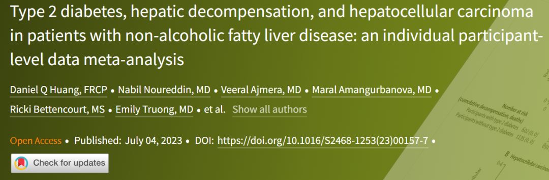 [1] Daniel Q Huang, et al., (2023). Type 2 diabetes, hepatic decompensation, and hepatocellular carcinoma in patients with non-alcoholic fatty liver disease: an individual participant-level data meta-analysis. The Lancet Gastroenterology & Hepatology, DOI:https://doi.org/10.1016/S2468-1253(23)00157-7