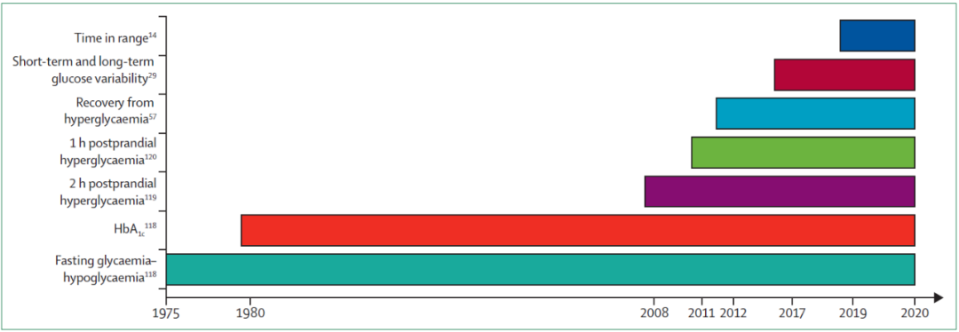 ▲糖尿病血糖管理指标的历史里程碑(1975-2021)(图片来源:参考资料[1])