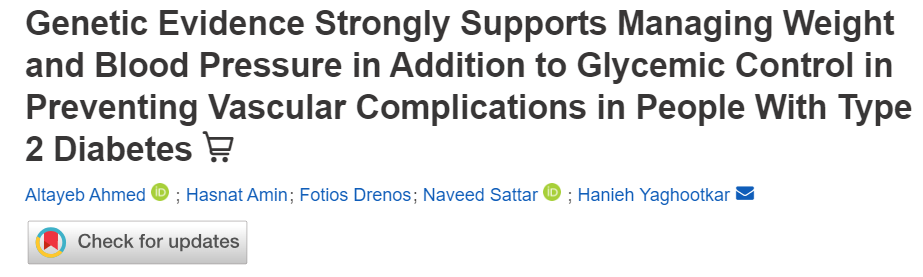 [1] Ahmed A, et al., (2023). Genetic Evidence Strongly Supports Managing Weight and Blood Pressure in Addition to Glycemic Control in Preventing Vascular Complications in People With Type 2 Diabetes [published online ahead of print, 2023 Aug 9]. Diabetes Care, doi:10.2337/dc23-0855