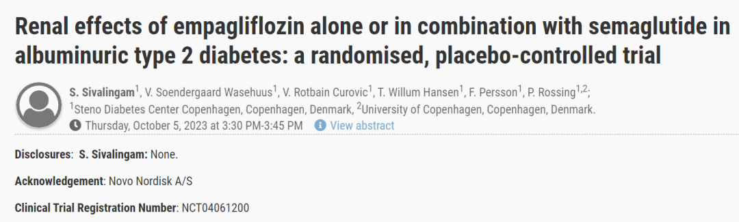 [1]S. Sivalingam, V. Soendergaard Wasehuus, V. Rotbain Curovic, et al. Renal effects of empagliflozin alone or in combination with semaglutide in albuminuric type 2 diabetes: a randomised, placebo-controlled trial. https://cattendee.abstractsonline.com/meeting/10899/presentation/413