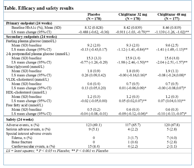 这项随机、双盲、安慰剂对照、3期研究,纳入533例二甲双胍单药治疗(≥1500 mg/d或最大耐受剂量)≥8周血糖控制不佳(糖化血红蛋白[HbA1c]:7.0%~10.5%)的2型糖尿病患者,并将其按1:1:1比例随机分配至chiglitazar 32 mg组(每日一次,n=178)、chiglitazar 48 mg组(每日一次,n=177)或安慰剂组(n=178)治疗。持续24周。