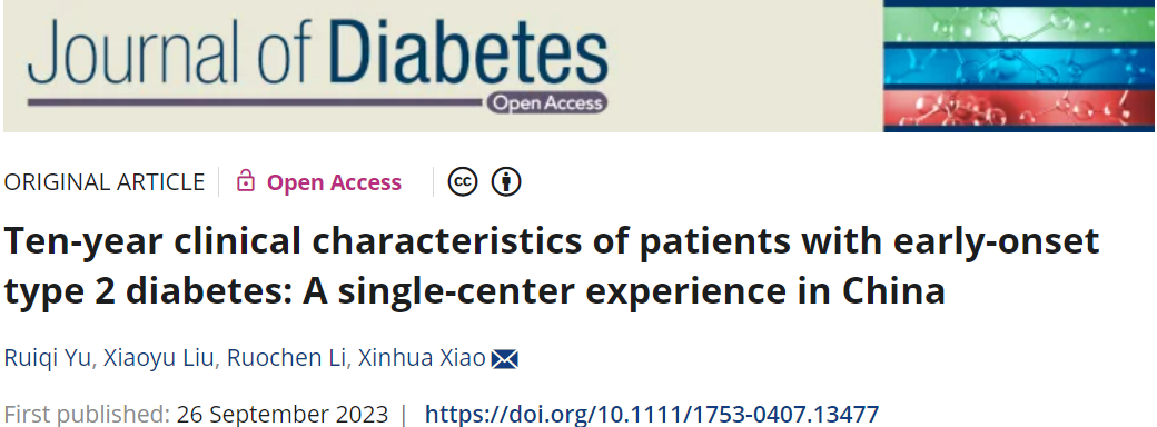 [1] Yu R, Liu X, Li R, et al. Ten-year clinical characteristics of patients with early-onset type 2 diabetes: A single-center experience in China. J Diabetes. 2023 Sep 26. doi: 10.1111/1753-0407.13477. Epub ahead of print. PMID: 37750029.