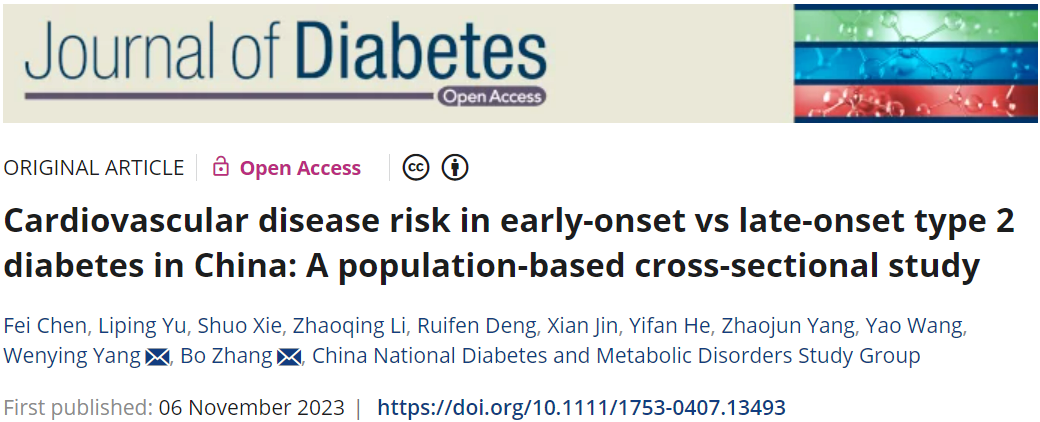 [1] Chen F, Yu L, Xie S, et al. Cardiovascular disease risk in early-onset vs late-onset type 2 diabetes in China: A population-based cross-sectional study. J Diabetes. 2023 Nov 6. doi: 10.1111/1753-0407.13493. Epub ahead of print. PMID: 37932230.