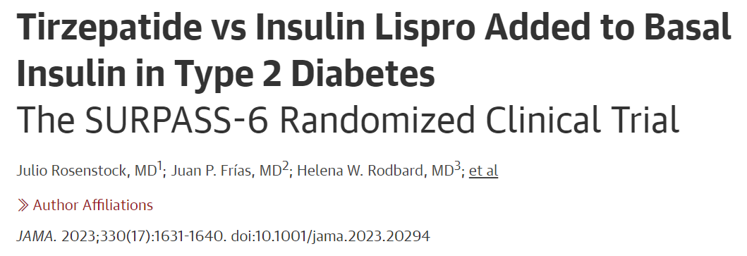 在基础胰岛素治疗血糖控制不佳的2型糖尿病患者中,每周一次tirzepatide+甘精胰岛素治疗与每日三次餐时赖脯胰岛素相比对血糖控制有何影响?近期发表于JAMA的一项研究(SURPASS-6)对此进行了评估。研究结果显示,在接受基础胰岛素治疗但血糖控制不佳的2型糖尿病患者中,与餐时胰岛素相比,每周一次tirzepatide+甘精胰岛素治疗,可以降低患者糖化血红蛋白(HbA1c)水平、体重以及低血糖事件发生率。