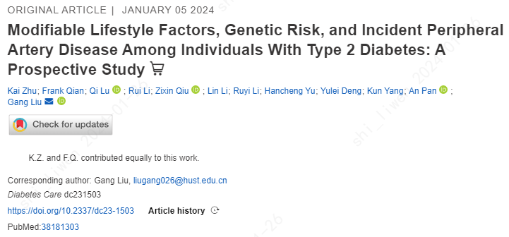 [1] Kai Zhu,Frank Qian, Qi Lu, et al. Modifiable Lifestyle Factors, Genetic Risk, and Incident Peripheral Artery Disease Among Individuals With Type 2 Diabetes: A Prospective Study. Diabetes Care 2024; dc231503. https://doi.org/10.2337/dc23-1503