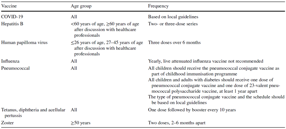 通过公共卫生管理,如改善个人卫生、避免到拥挤的环境和佩戴口罩,可以减少部分感染传播,但公众对于这些预防措施的认识和依从性仍有待提高。尚无证据表明,强化降糖治疗或减肥有助于降低糖尿病患者的感染率。一些常见感染可接种疫苗预防,虽然不同国家的疫苗接种剂量有差异,但国际指南还是建议糖尿病成人患者接受常规疫苗接种。