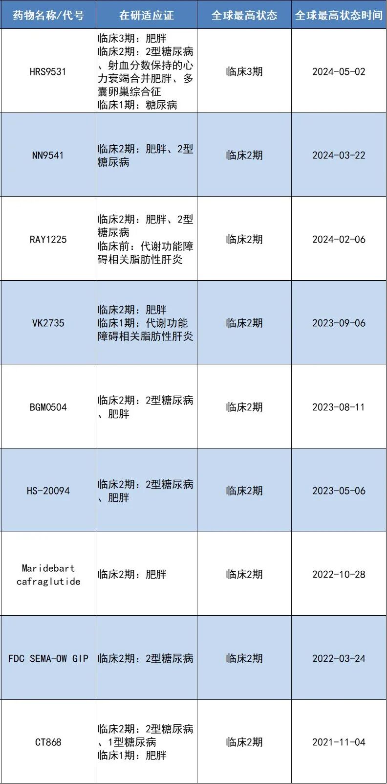 据公开资料,目前处于活跃研发状态且进入临床2~3期的GLP-1/GIP双重受体激动剂共有9款。