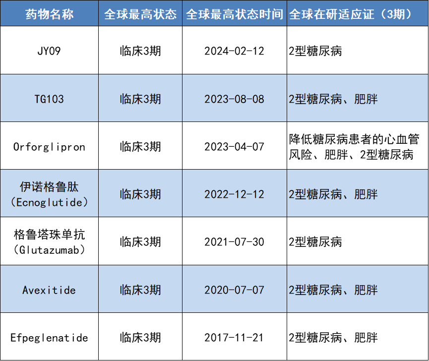 总之,目前GLP-1受体激动剂在治疗2型糖尿病和肥胖有较好的表现,且对于2型糖尿病患者心血管疾病和肾病也有获益证据。据公开资料,已有5款GLP-1受体激动剂获美国FDA批准上市,当前处于活跃研发状态且已经进入临床3期的GLP-1受体激动剂创新药共有7款。