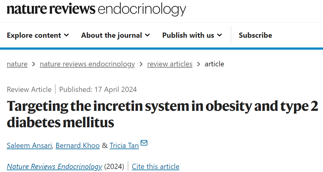 [1] Ansari, S., Khoo, B. & Tan, T. Targeting the incretin system in obesity and type 2 diabetes mellitus. Nat Rev Endocrinol (2024). https://doi.org/10.1038/s41574-024-00979-9