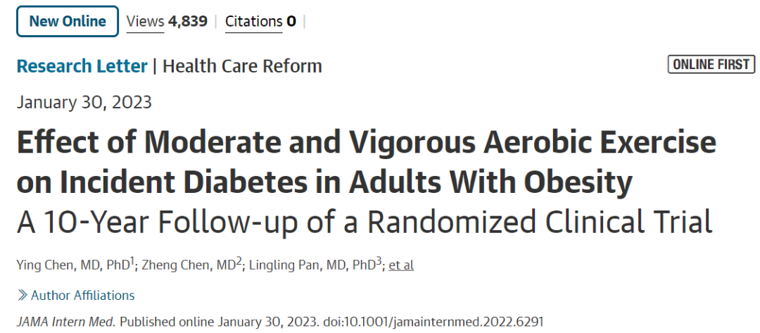 [1] Ying Chen et al. Effect of Moderate and Vigorous Aerobic Exercise on Incident Diabetes in Adults With Obesity: A 10-Year Follow-up of a Randomized Clinical Trial. JAMA Internal Medicine 2023; doi: 10.1001/jamainternmed.2022.6291