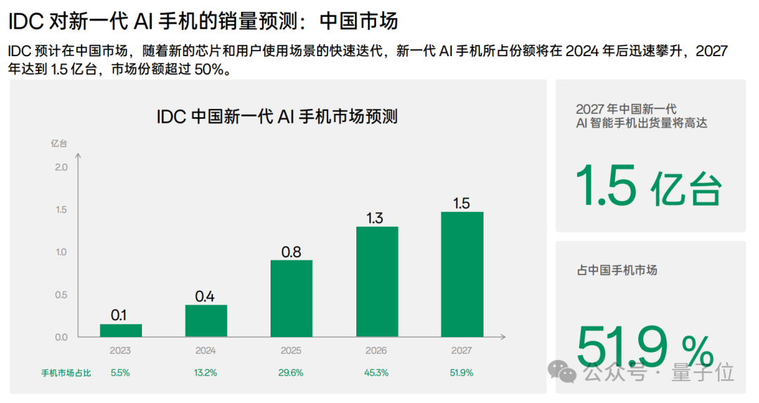 在中国市场,随着新芯片和用户使用场景的快速迭代,新一代AI手机所占份额在2024年后迅速攀升,2027年达到1.5亿台,市场份额超过50%。