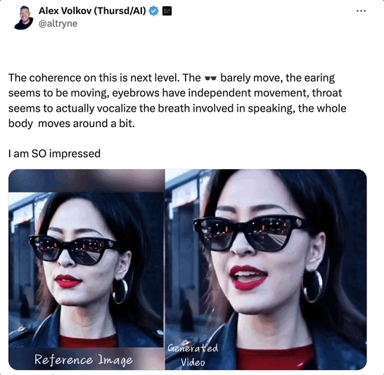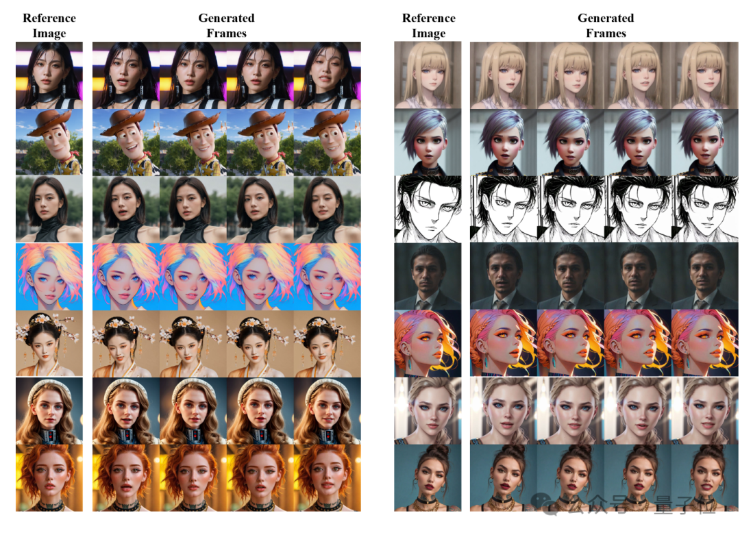 有了它,输入单张参考图像,以及一段音频(说话、唱歌、rap均可),就能生成表情生动的AI视频。视频最终长度,取决于输入音频的长度。