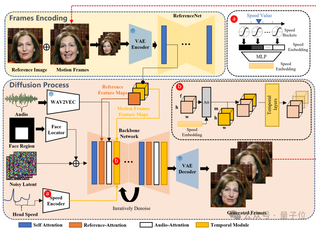 随后是骨干网络主导去噪操作。在骨干网络中应用了两种注意力,参考注意力和音频注意力,分别作用于保持角色的身份一致性和调节角色的运动。