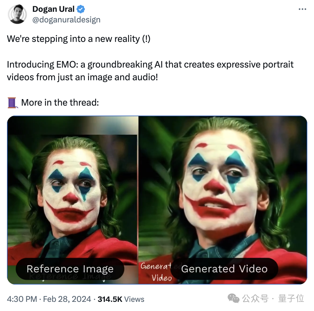 总之,不管是让肖像唱歌(不同风格的肖像和歌曲)、让肖像开口说话(不同语种)、还是各种“张冠李戴”的跨演员表演,EMO的效果,都让咱看得一愣一愣的。