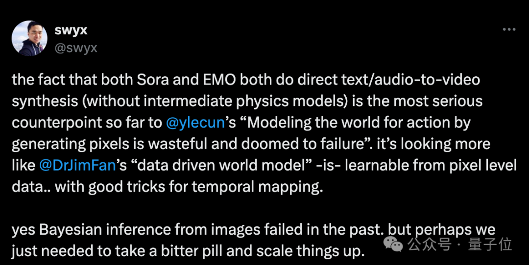 因此有人认为,这与Lecun坚持的“通过生成像素来为动作建模世界是浪费且注定要失败的”观点相悖,更支持了Jim Fan的“数据驱动的世界模型”思想。