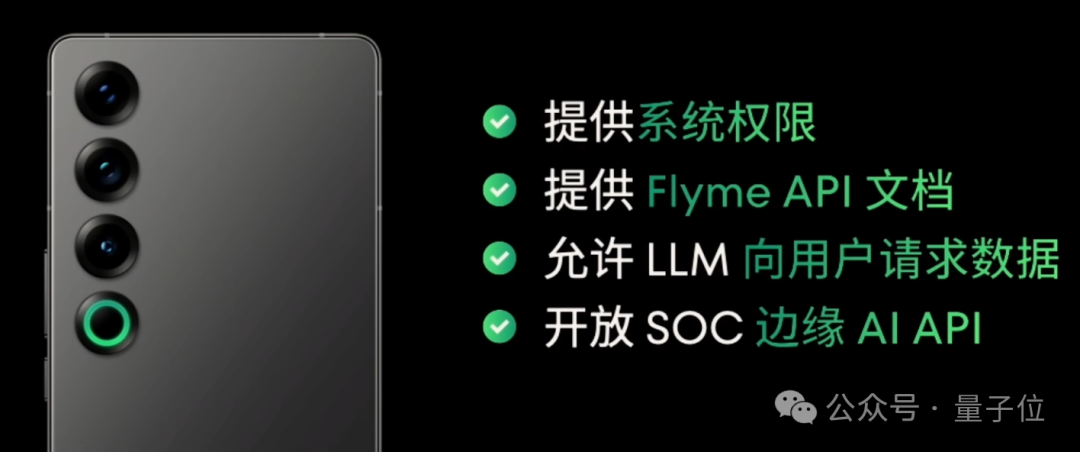 通过对所有大模型平台开放,提供系统权限、Flyme API文档、允许LLM向用户请求数据、开放SOC 边缘AI API,把更加AI的事情交给大模型公司和开发者来做。