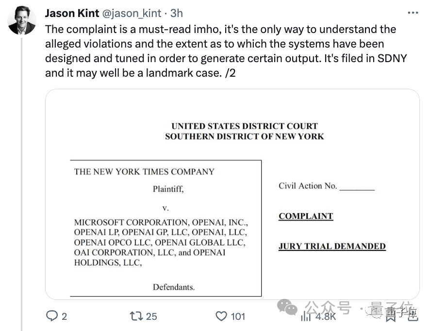 去年12月27日,纽约时报突然一纸状书、220000页附件,递交到地方法院状告OpenAI侵权,当然还包括微软。