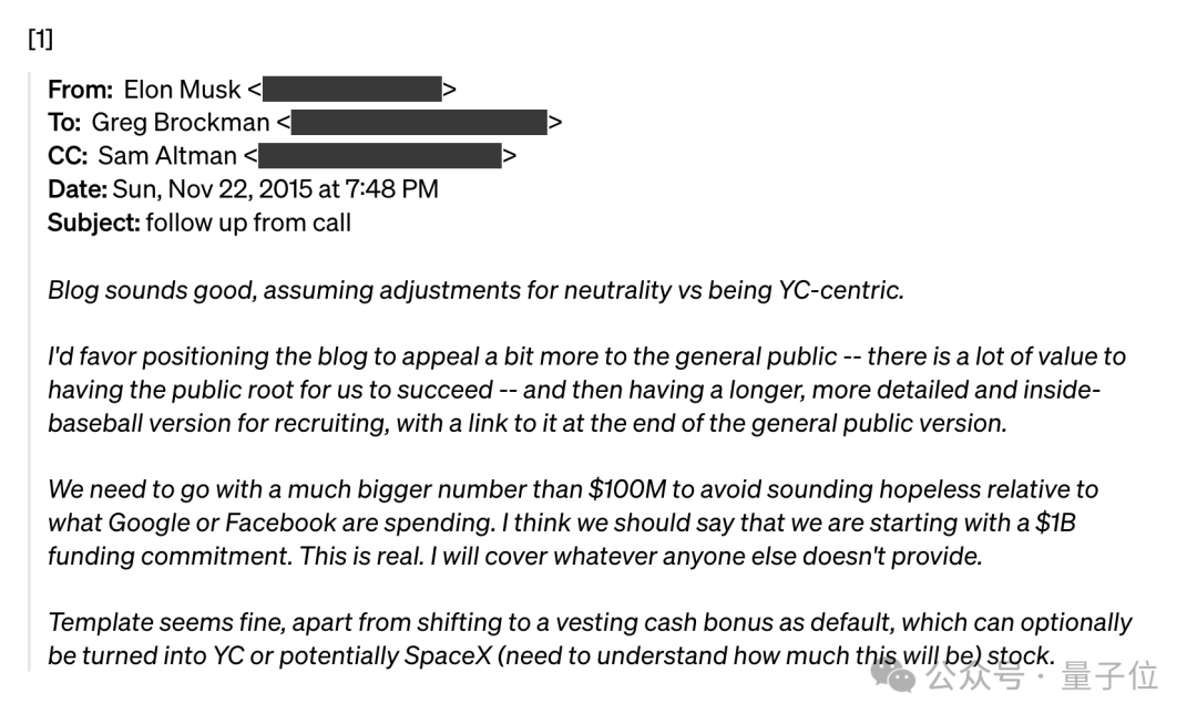 第一封邮件由马斯克写给Brockman,其中提及了10亿美元的资金需求,以及马斯克对补足未能筹集部分的承诺。