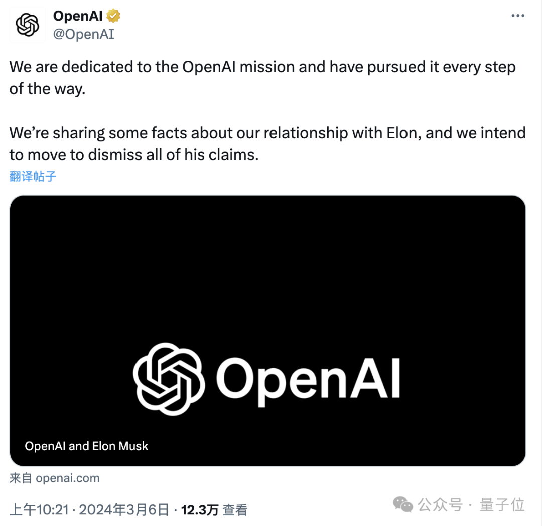 在官方推特中,OpenAI表示自己始终坚持使命,并将对马斯克的所有主张进行反驳。