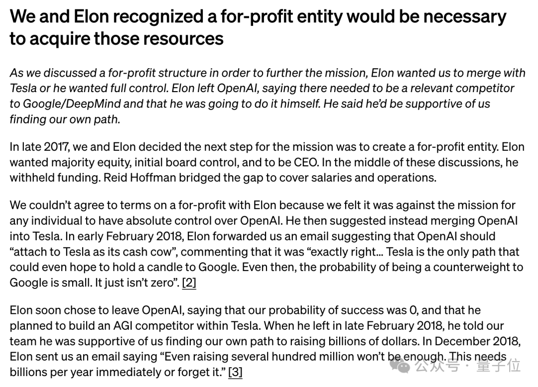 帖中附带的,是一则更为详细的官方通告,介绍了OpenAI与马斯克的爱恨情仇,还公开了马斯克与OpenAI高管的往来邮件。