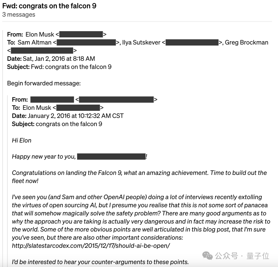 第四封邮件是马斯克还未离开OpenAI时,有人向他发贺电庆祝猎鹰9飞船取得成功,但更多谈论的是开源AI的潜在安全问题,并询问他对此的看法。
