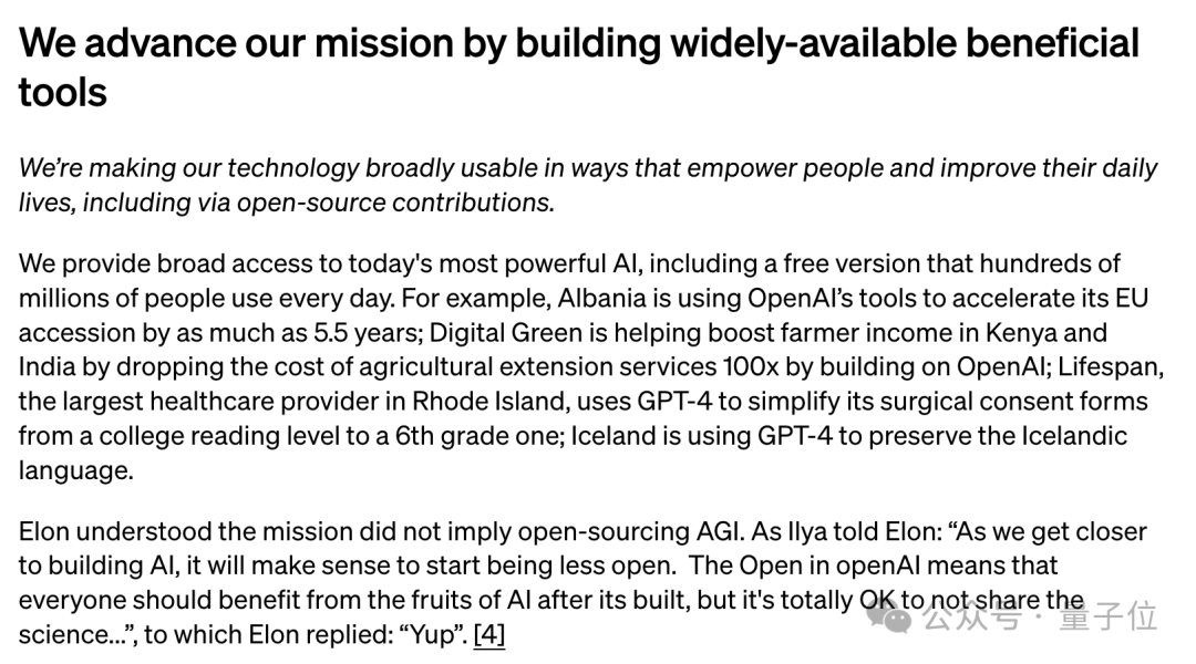 OpenAI认为,让人类从AGI中获益的使命,并不意味着开源AGI,并称马斯克也明白这一观点。