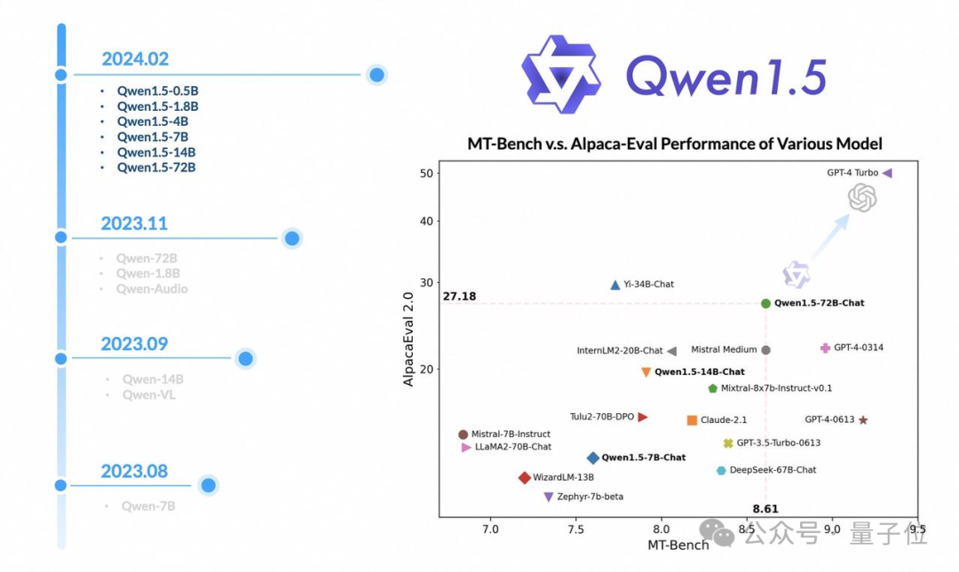 最大的Qwen1.5-72B-Chat模型,在MT-Bench和Alpaca-Eval v2上,超越Claude-2.1、GPT-3.5-Turbo-0613,甚至部分任务得分已超过前几个版本的GPT-4。