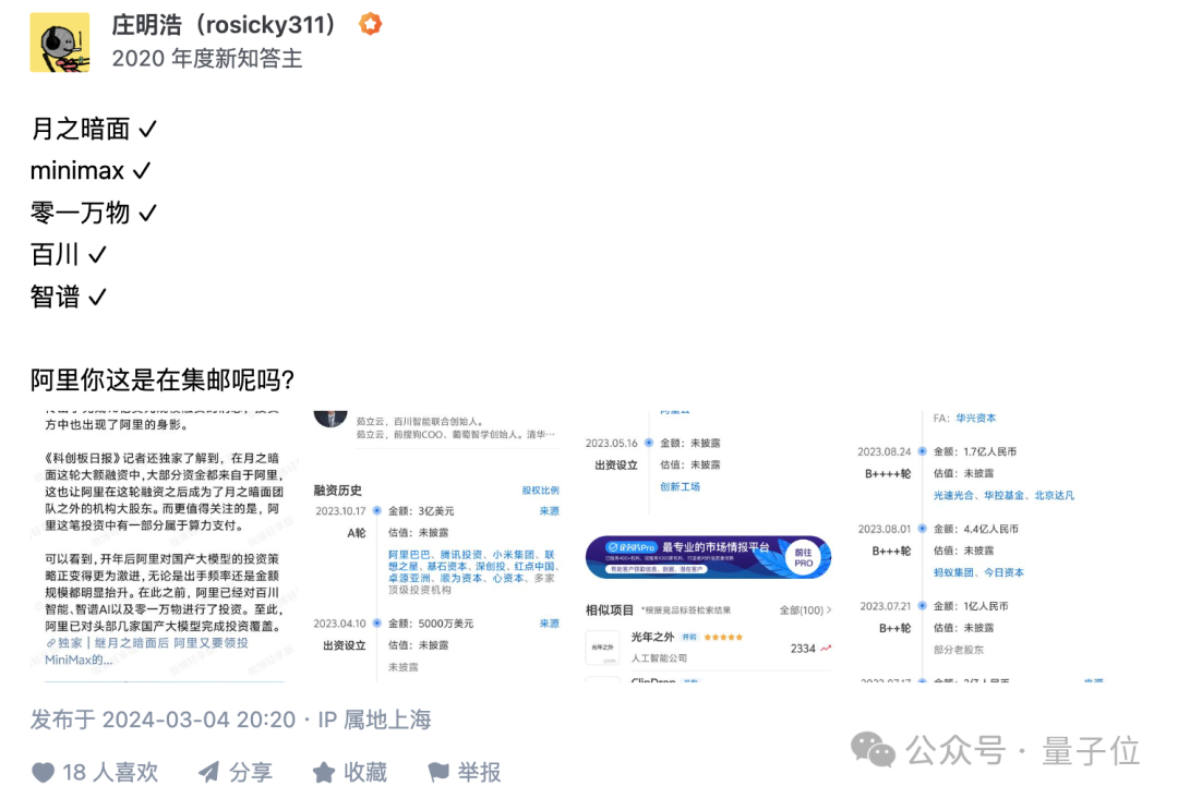 而阿里在国产大模型这一块,出 手 大 方,智谱、百川、月之暗面、零一万物、MiniMax投了个遍。