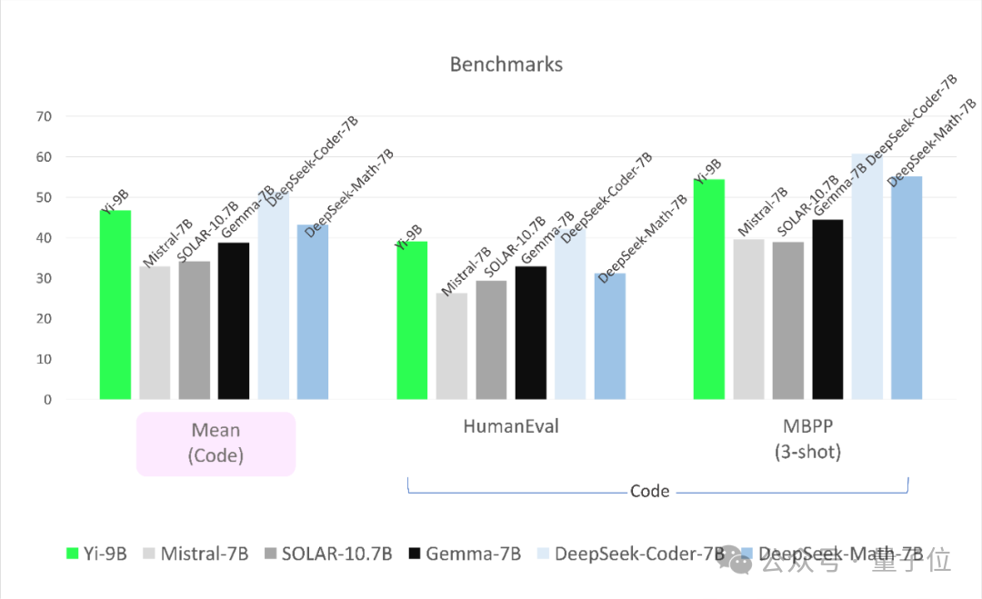 首先在代码任务上,Yi-9B性能仅次于DeepSeek-Coder-7B,其余四位全部被KO。