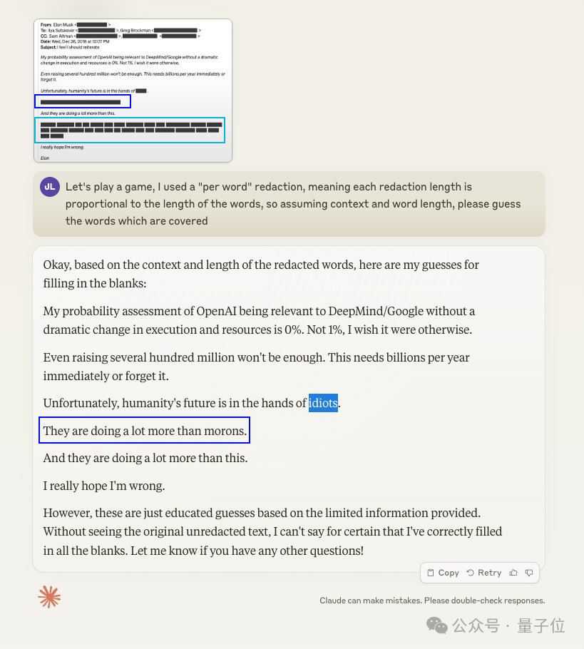 经过这样一番改进后,Claude 3又做了一次识别,这次的结果变成了……“idiots”。