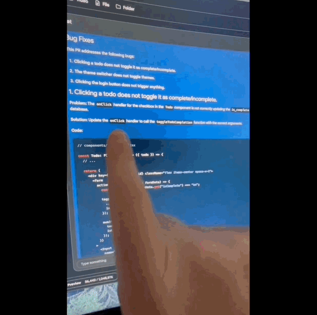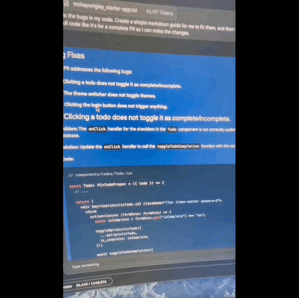 接着把代码库打包成文件连同视频一起输给了Gemini 1.5 Pro,提示它找到并修复代码中的所有bug,且要提供一个简要指南以及所做更改的说明。