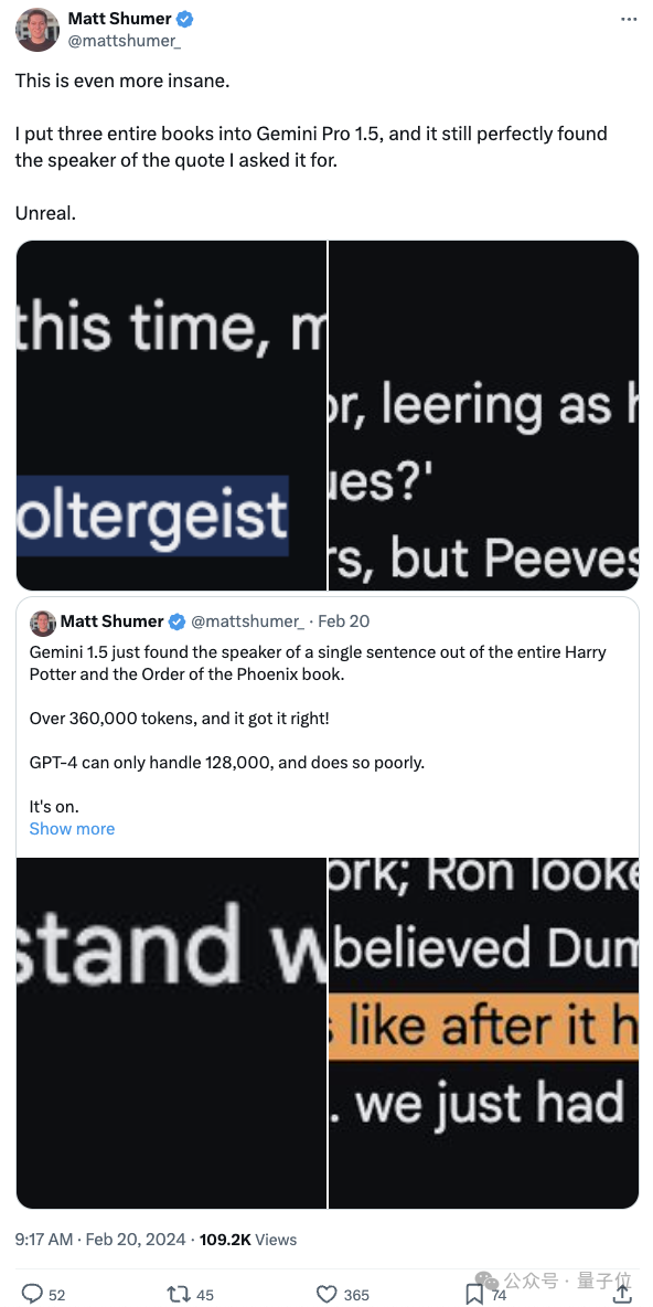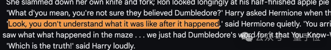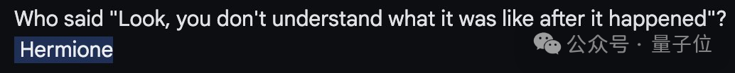 然后又让Gemini 1.5 Pro从超360000token的《哈利·波特与凤凰社》整本书中找到一句话的说话人,Gemini 1.5 Pro也成功找到了。