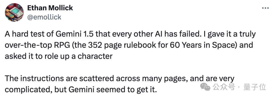 Ethan Mollick教授表示,对所有其他AI进行这项测试都是失败的,只有Gemini 1.5 Pro成功了。