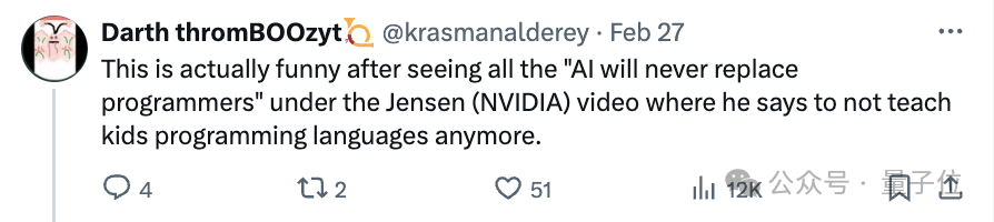 有网友表示想起来一件事觉得有趣:英伟达黄院士前段时间曾公开表示“孩子们以后不需要学编程了”,那时候还有很多人反对称“AI不会取代程序员”