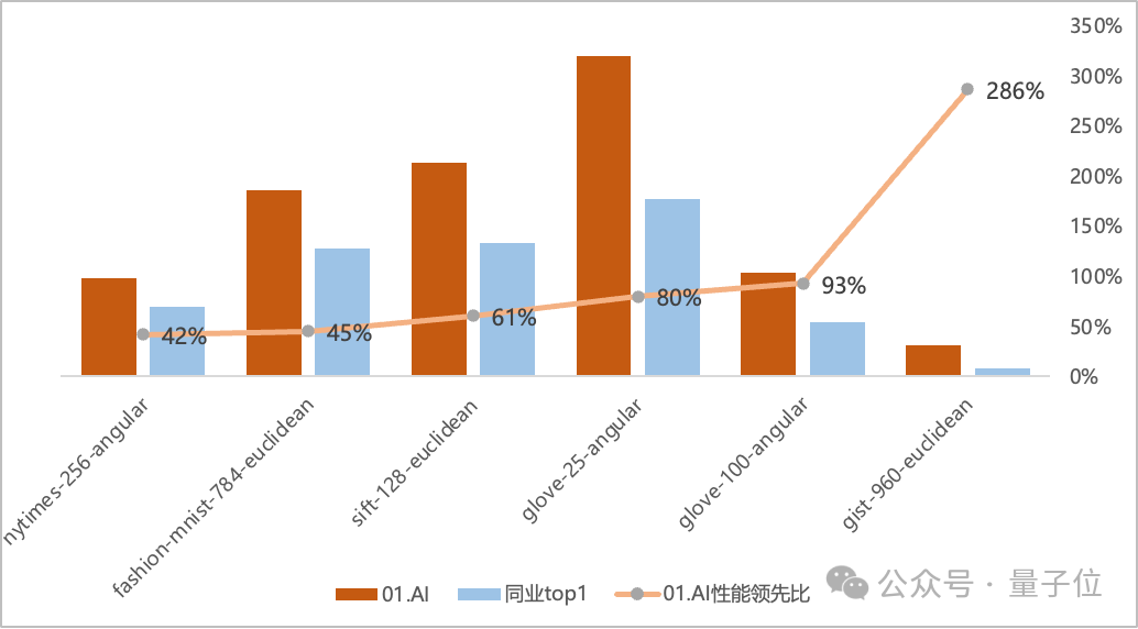 在原榜单TOP1基础上,零一万物笛卡尔向量数据库实现了显著性能提升,部分数据集上的性能提升超过2倍以上,在gist-960-euclidean数据集维度更大幅领先榜单原TOP1 286%。