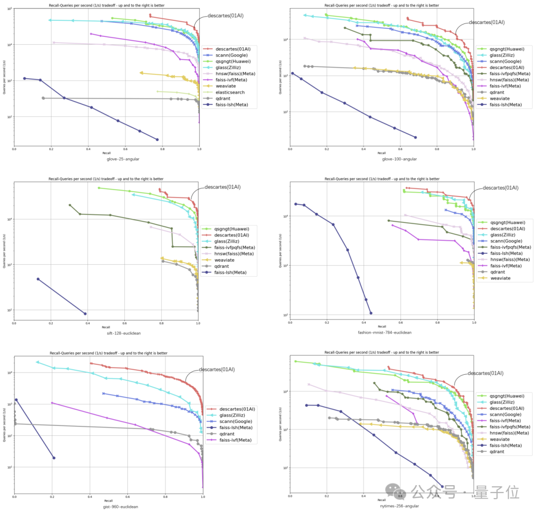 而笛卡尔参与全部六个数据集评测,它们主要考察在不同召回下的查询性能。