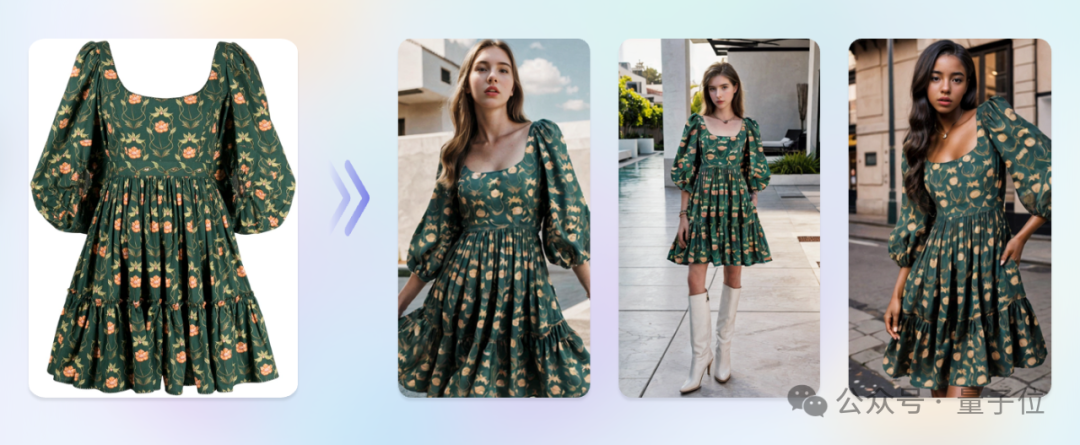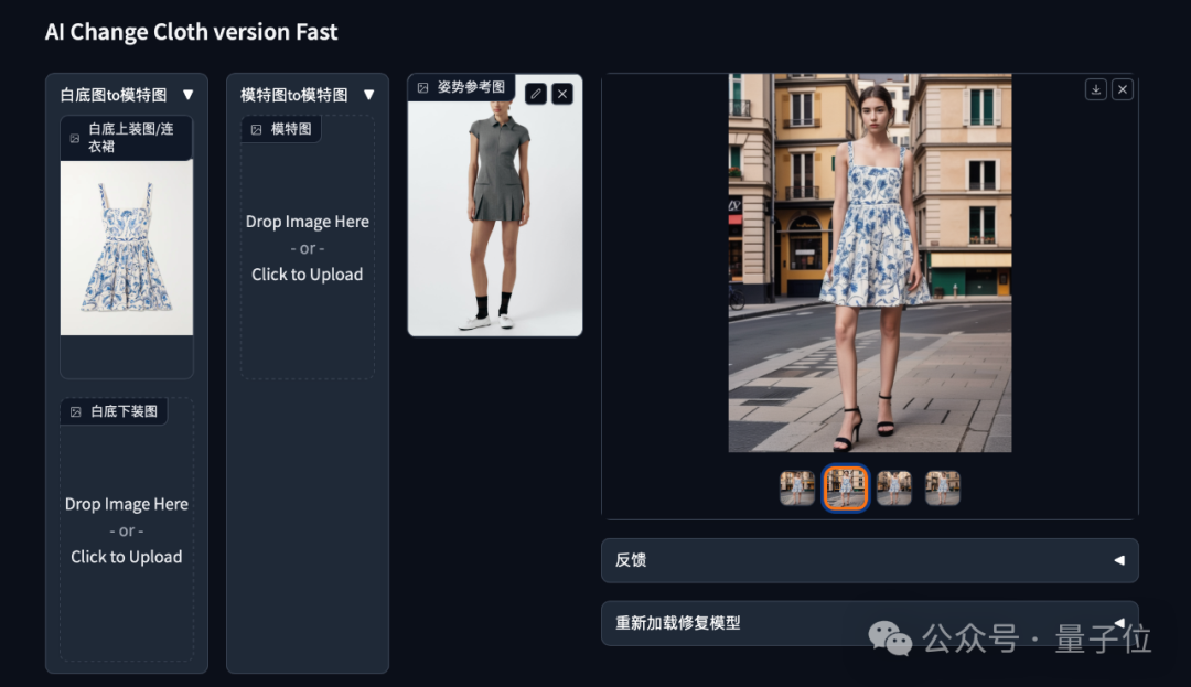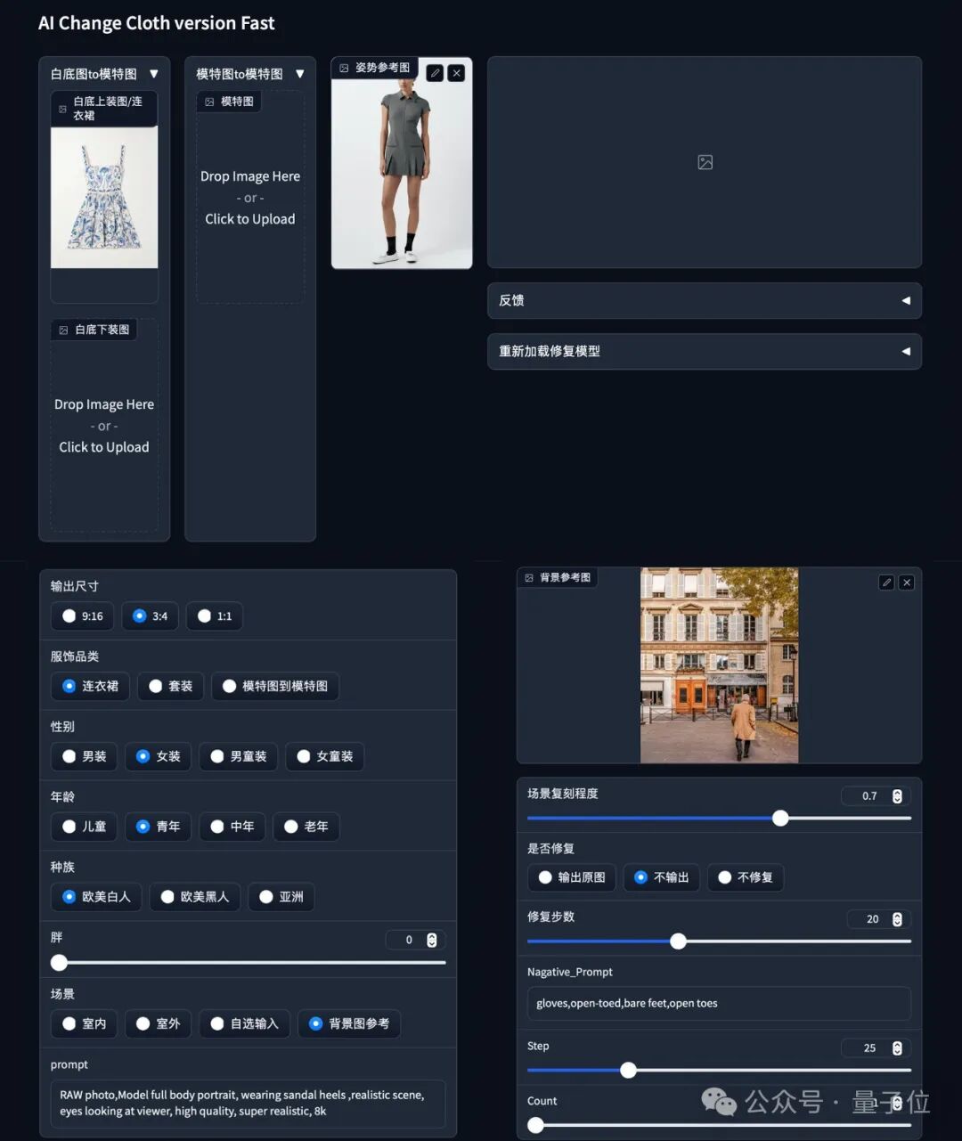 首先需要上传一张服装图像,接着上传可供参考的模特姿势,同时选择模特的性别、人种等,继而再上传(最少)一张背景参考图,就能得到最终的模特上身效果。